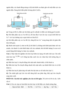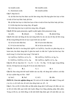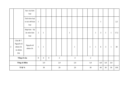 Đại cương tính chất vật lí 1 2b 1 về kim của kim loại loại Tính chất hóa 1 1 học của kim loại Tách kim loại và tái chế kim 1 1 2,5 loại Hợp kim - Sự ăn mòn kim 2 1 1 1 3 1 1 17,5 loại Chủ đề 7. Nguyên tố Nguyên tố 3 nhóm IA 1 1 1 1 1 1 3 1 30 nhóm IA và nhóm IIA Tổng số câu 8 4 0 2 4 2 Tổng số điểm 3,0 2,0 2,0 3,0 4,0 3,0 3,0 Tỉ lệ % 30 20 20 30 40 30 30 100 III. Đề tham khảo