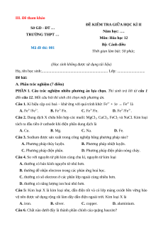 ĐỀ KIỂM TRA GIỮA HỌC KÌ II Sở GD - ĐT … Năm học: …. TRƯỜNG THPT … Môn: Hóa học 12 Bộ: Cánh diều Mã đề thi: 001