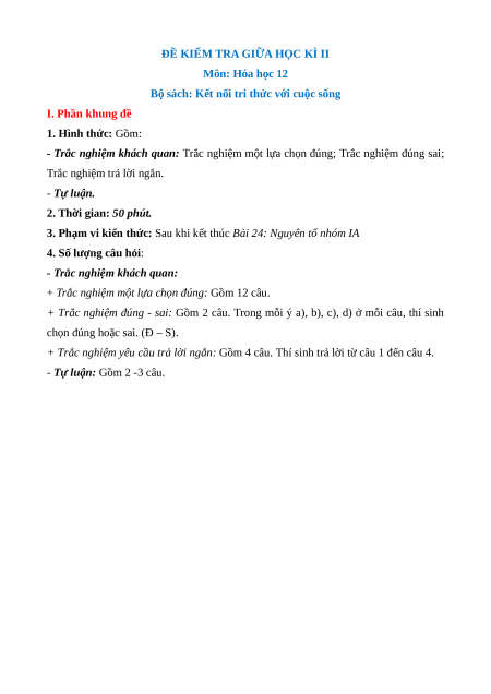 - Tailieugiaovien.com.vn giới thiệu bộ 3 đề giữa kì 2 gồm đầy đủ ma trận và lời giải chi tiết môn Hóa học 12 Kết nối tri thức mới nhất năm 2025 nhằm giúp Giáo viên có thêm tài liệu tham khảo ra đề thi Hóa học 12.