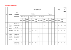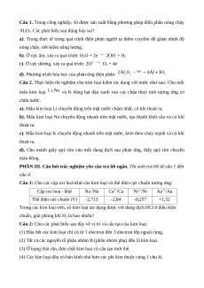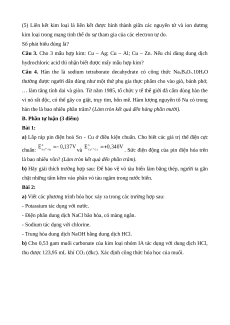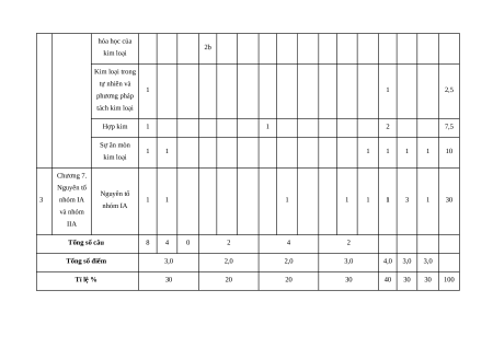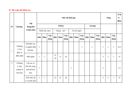 II. Ma trận đề kiểm tra Tỉ lệ Mức độ đánh giá Tổng % điểm Nội TT Chương dung/đơn TNKQ Tự luận vị kiến thức Nhiều lựa chọn “Đúng – Sai” Trả lời ngắn Vận Vận Vận Vận Vận Biết Hiểu Biết Hiểu Biết Hiểu Biết Hiểu Biết Hiểu dụng dụng dụng dụng dụng Thế điện cực Chương và nguồn điện 1 1 1 1 1 1 12,5 5. Pin 1 hóa học điện và điện phân 1a Điện phân 1 1 1c 1d 3 2 1 15 1b 2 Chương Cấu tạo và 6. Đại liên kết trong 1 1 2 7,5 cương về tinh thể kim kim loại loại Tính chất vật 1 1 2a 2c 2d 3 2 1 15 lí và tính chất hóa học của 2b kim loại Kim loại trong tự nhiên và 1 1 2,5 phương pháp tách kim loại Hợp kim 1 1 2 7,5 Sự ăn mòn 1 1 1 1 1 1 10 kim loại Chương 7. Nguyên tố Nguyên tố 3 nhóm IA 1 1 1 1 1 1 3 1 30 nhóm IA và nhóm IIA Tổng số câu 8 4 0 2 4 2 Tổng số điểm 3,0 2,0 2,0 3,0 4,0 3,0 3,0 Tỉ lệ % 30 20 20 30 40 30 30 100 III. Đề tham khảo