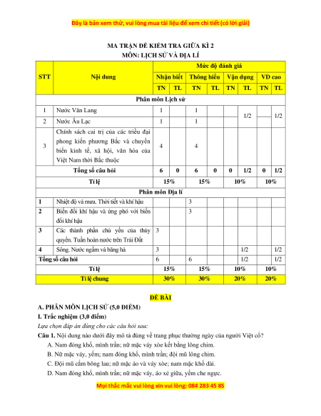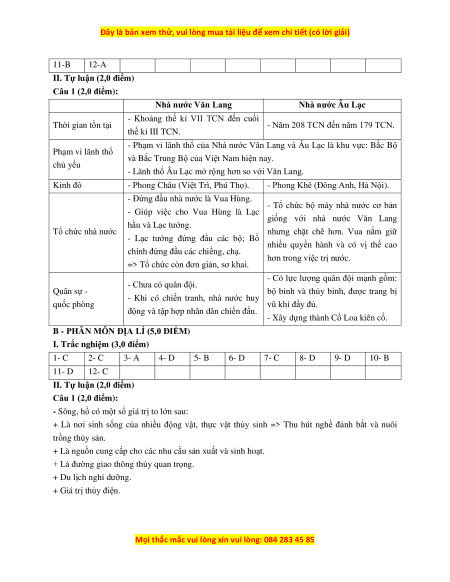 Câu 1 (2,0 điểm): So sánh nhà nước Văn Lang và Âu Lạc theo các tiêu chí sau đây: thời gian
