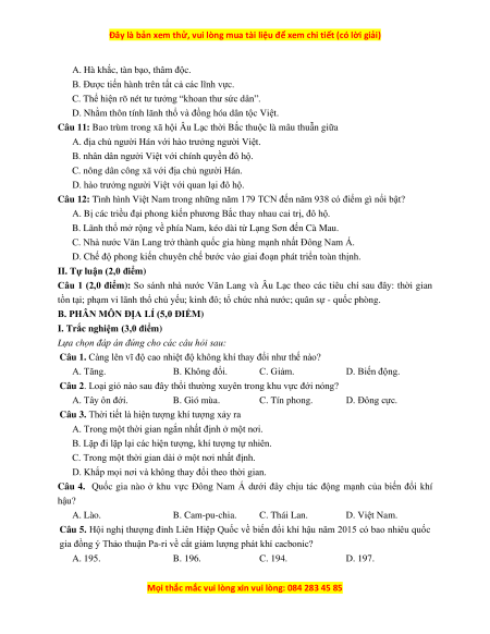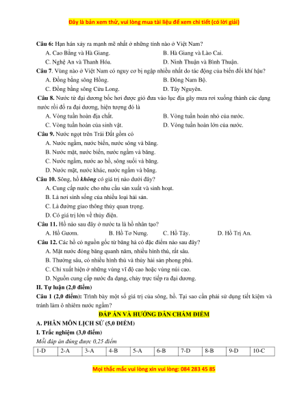Câu 6: Hạn hán xảy ra mạnh mẽ nhất ở những tỉnh nào ở Việt Nam? A. Cao Bằng và Hà Giang. B. Hà Giang và Lào Cai. C. Nghệ An và Thanh Hóa.