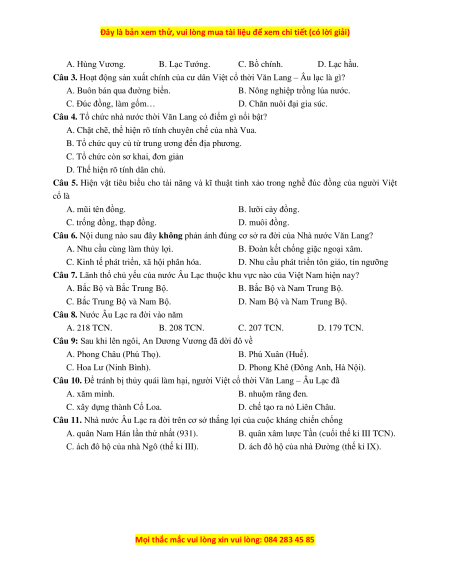 Câu 8. Nước Âu Lạc ra đời vào năm A. 218 TCN. B. 208 TCN. C. 207 TCN. D. 179 TCN.