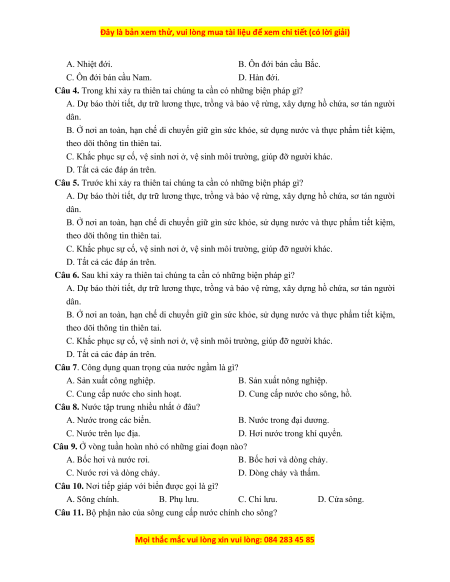 Câu 8. Nước tập trung nhiều nhất ở đâu? A. Nước trong các biển.