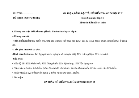MA TRẬN, BẢNG ĐẶC TẢ, ĐỀ KIỂM TRA GI A H Ữ C KÌ II Ọ T KHO Ổ A H C T Ọ NHIÊN Ự Môn: Sinh h c l ọ p 11 ớ Bộ sách: K t n ế i tri th ố c ứ 1. Khung ma tr n đ ậ ki ề m tr ể a gi a kì II ữ môn Sinh h c – l ọ p 11 ớ a. Khung ma trận - Th i ờ đi m ể ki m ể tra: Ki m ể tra gi a ữ h c ọ kì II khi k t ế thúc n i ộ dung: Bài 23. Th c