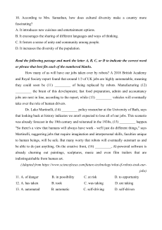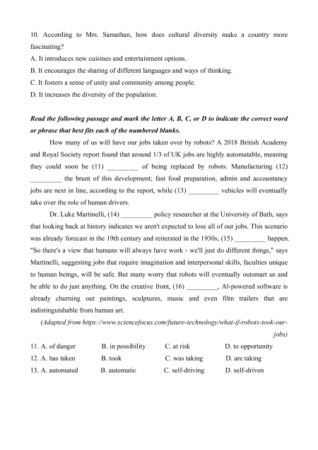 (Adapted from https://www.sciencefocus.com/future-technology/what-if-robots-took-our- jobs) 11. A. of danger B. in possibility C. at risk D. to opportunity 12. A. has taken B. took C. was taking D. are taking 13. A. automated B. automatic C. self-driving D. self-driven 14. A. the B. a C. an D. ∅ 15. A. for it didn't B. yet it didn't C. so it didn't D. nor did it 16. A. as a result B. for example