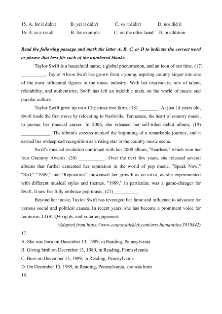 Taylor Swift grew up on a Christmas tree farm. (18) ________. At just 14 years old,