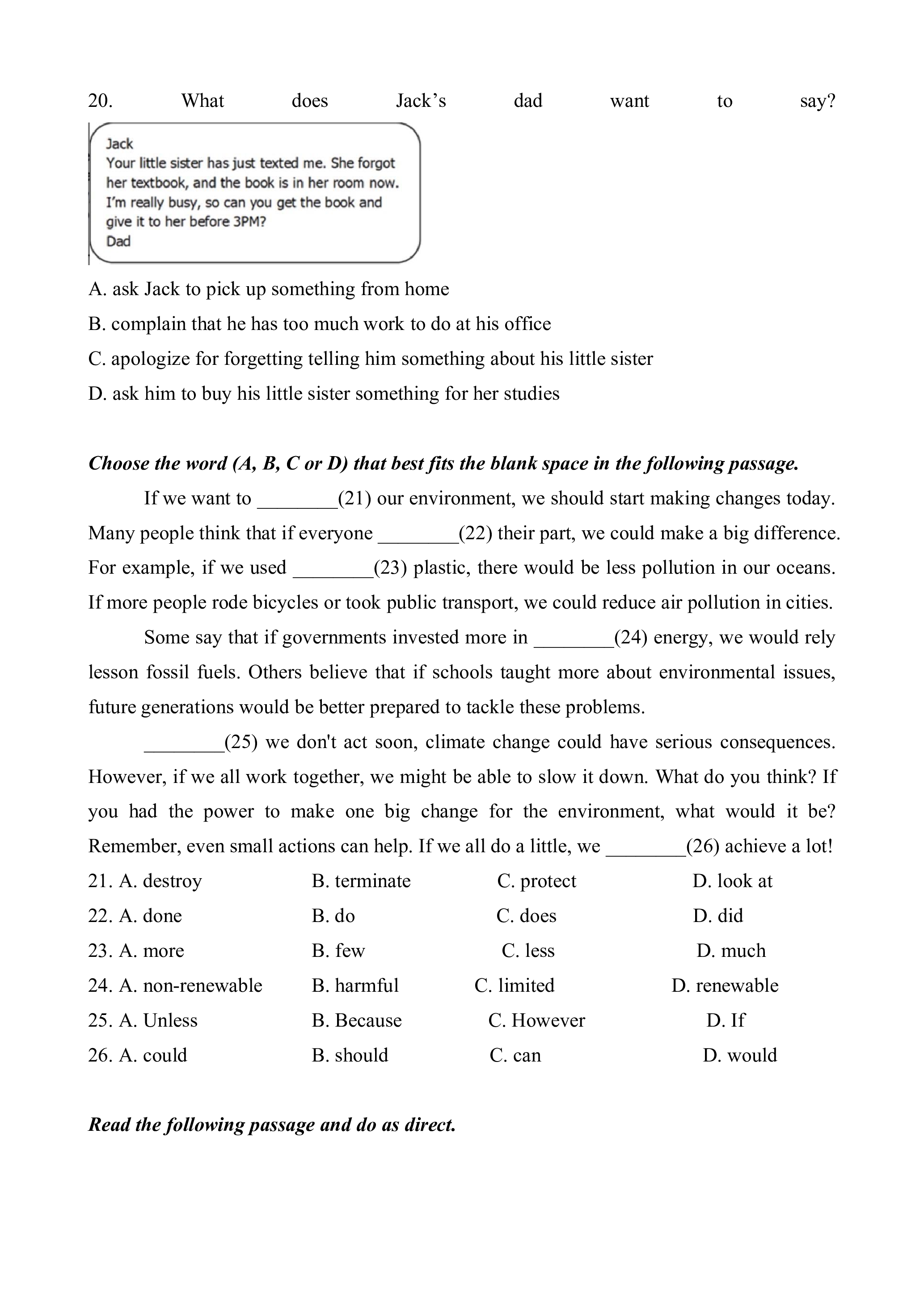 Remember, even small actions can help. If we all do a little, we ________(26) achieve a lot! 21. A. destroy B. terminate C. protect D. look at 22. A. done B. do C. does D. did 23. A. more B. few C. less D. much 24. A. non-renewable B. harmful C. limited D. renewable 25. A. Unless B. Because C. However D. If 26. A. could B. should C. can D. would