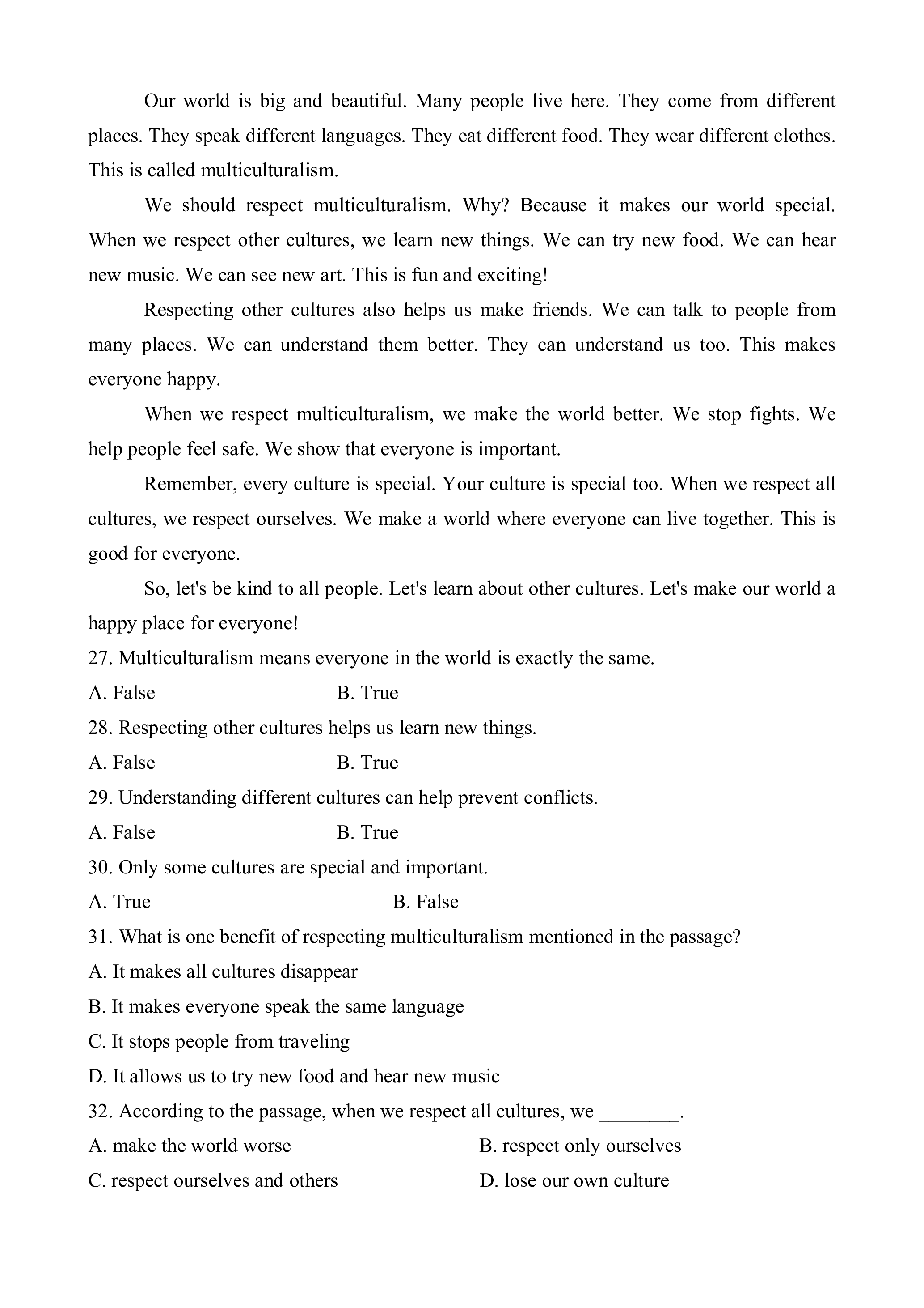 32. According to the passage, when we respect all cultures, we ________. A. make the world worse B. respect only ourselves