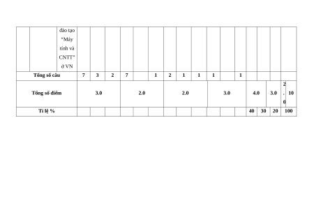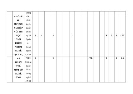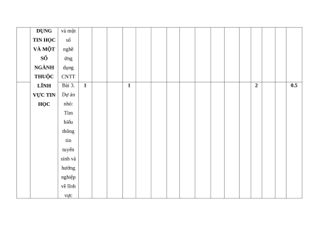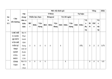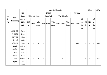 Mức độ đánh giá Tổng điểm Nội TNKQ Tự luận Im dung/ Nhiều lựa chọn Đúng/sai Trả lời ngắn Chủ k đơn vị Vậ Vậ đề/chương TT kiến Biế Vận Vận Vận n Bi Hiể n Hiểu Biết Hiểu Biết Hiểu Biết Hiểu thức t dụng dụng dụng dụ ết u dụ ng ng CHỦ ĐỀ Bài 9: F. GIẢI Thực QUYẾT hành VẤN ĐỀ định VỚI SỰ dạng 1 1 1 1 1 1 1TL 3 2 2 3.75 TRỢ một số GIÚP thuộc CỦA tính MÁY CSS TÍNH Bài 10: 1 1 1 1 1 2 2 1 1.5 TẠO Bộ chọn TRANG lớp, bộ WEB chọn định danh Bài 11: Mô hình hộp, bố 1 1 1 2 0 1 1 cục trang web Bài 12: 1 1 1 1 0.5 Dự án nhỏ: Tạo trang web báo tường CHỦ ĐỀ Bài 1. G. Giới HƯỚNG thiệu NGHIỆP nghề VỚI TIN Dịch HỌC vụ và 1 1 1 1 1 2 1 1.25 GIỚI Quản THIỆU trị NHÓM trong NGHỀ ngành DỊCH VỤ CNTT VÀ Bài 2. 1 1 1TL 2 1 1.5 QUẢN Một số TRỊ, nghề MỘT SỐ khác NGHỀ trong ỨNG ngành CNTT DỤNG và một TIN HỌC số VÀ MỘT nghề SỐ ứng NGÀNH dụng THUỘC CNTT LĨNH Bài 3. 1 1 2 0.5 VỰC TIN Dự án HỌC nhỏ: Tìm hiểu thông tin tuyển sinh và hướng nghiệp về lĩnh vực
