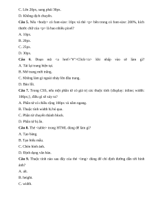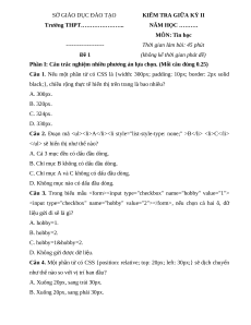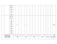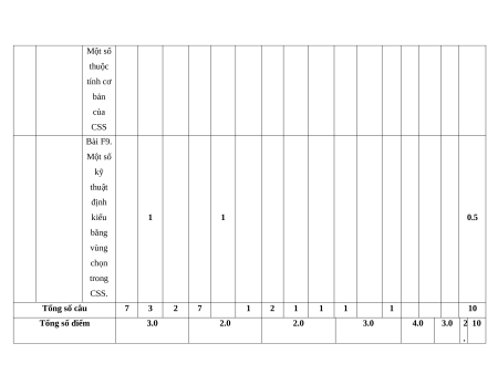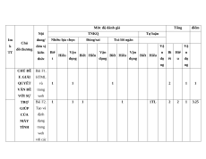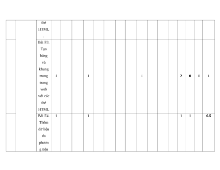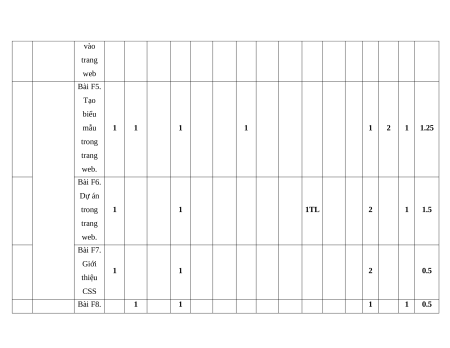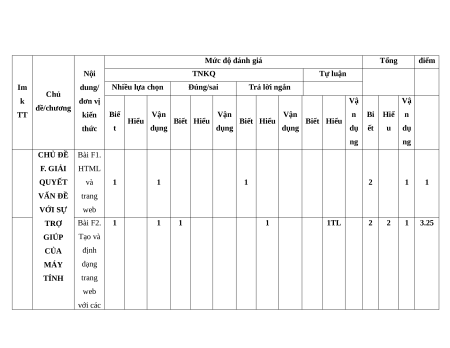 Mức độ đánh giá Tổng điểm Nội TNKQ Tự luận Im dung/ Nhiều lựa chọn Đúng/sai Trả lời ngắn Chủ k đơn vị Vậ Vậ đề/chương TT kiến Biế Vận Vận Vận n Bi Hiể n Hiểu Biết Hiểu Biết Hiểu Biết Hiểu thức t dụng dụng dụng dụ ết u dụ ng ng CHỦ ĐỀ Bài F1. F. GIẢI HTML QUYẾT và 1 1 1 2 1 1 VẤN ĐỀ trang VỚI SỰ web TRỢ Bài F2. 1 1 1 1 1TL 2 2 1 3.25 GIÚP Tạo và CỦA định MÁY dạng TÍNH trang web với các thẻ HTML . Bài F3. Tạo bảng và khung trong 1 1 1 2 0 1 1 trang web với các thẻ HTML Bài F4. 1 1 1 1 0.5 Thêm dữ liệu đa phươn g tiện vào trang web Bài F5. Tạo biểu mẫu 1 1 1 1 1 2 1 1.25 trong trang web. Bài F6. Dự án trong 1 1 1TL 2 1 1.5 trang web. Bài F7. Giới 1 1 2 0.5 thiệu CSS Bài F8. 1 1 1 1 0.5 Một số thuộc tính cơ bản của CSS Bài F9. Một số kỹ thuật định kiểu 1 1 0.5 bằng vùng chọn trong CSS. Tổng số câu 7 3 2 7 1 2 1 1 1 1 10 Tổng số điểm 3.0 2.0 2.0 3.0 4.0 3.0 2 10 .