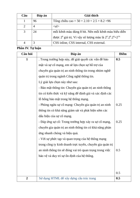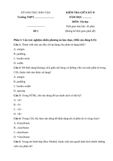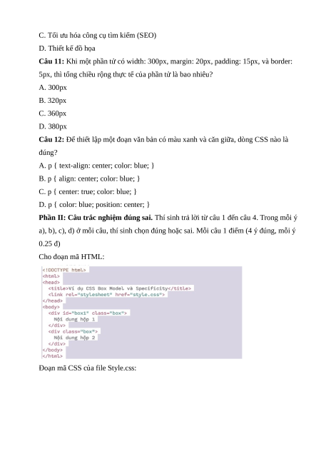 a), b), c), d) ở mỗi câu, thí sinh chọn đúng hoặc sai. Mỗi câu 1 điểm (4 ý đúng, mỗi ý 0.25 đ) Cho đoạn mã HTML: