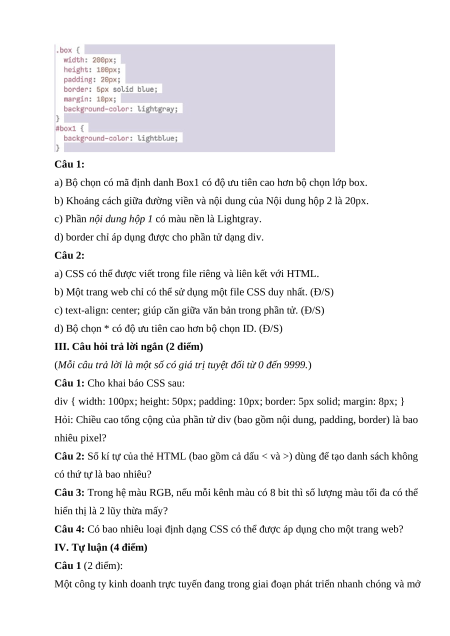 d) border chỉ áp dụng được cho phần tử dạng div. Câu 2: