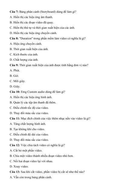 Câu 5: Mục đích chính của việc sử dụng phần mềm làm video là gì? A. Chơi game. B. Lập trình.