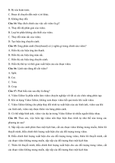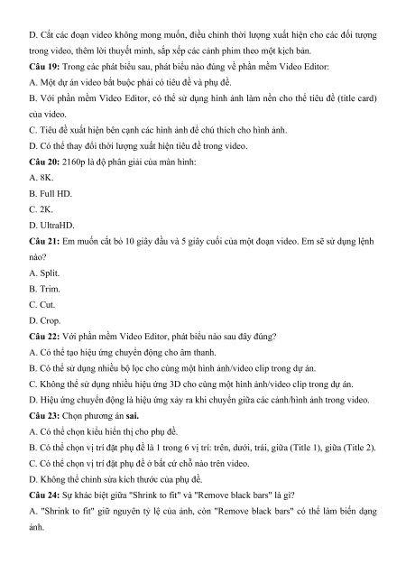 Câu 16: Lệnh nào dùng để cắt video? A. Split. B. Cut. C. Trim. D. Crop.