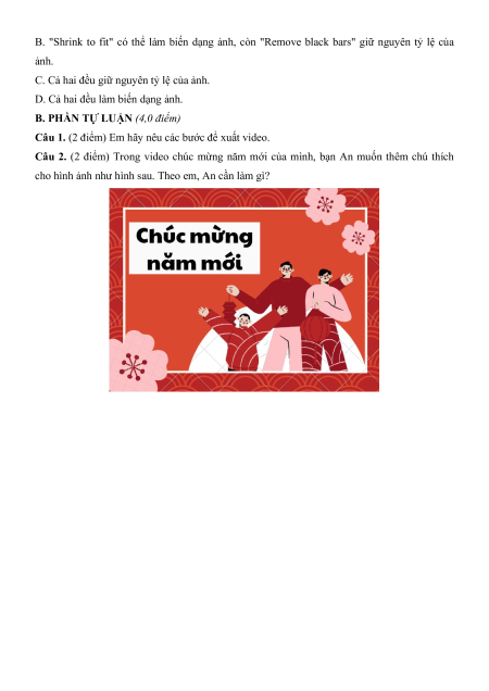 Câu 3: Bước đầu tiên khi tạo một video là gì? A. Chỉnh sửa video. B. Xuất video. C. Chuẩn bị tư liệu. D. Thêm hiệu ứng.