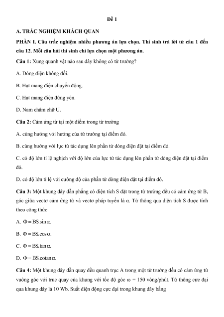 PHẦN I. Câu trắc nghiệm nhiều phương án lựa chọn. Thí sinh trả lời từ câu 1 đến