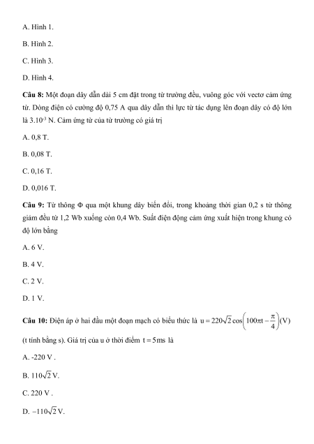 Câu 8: Một đoạn dây dẫn dài 5 cm đặt trong từ trường đều, vuông góc với vectơ cảm ứng