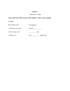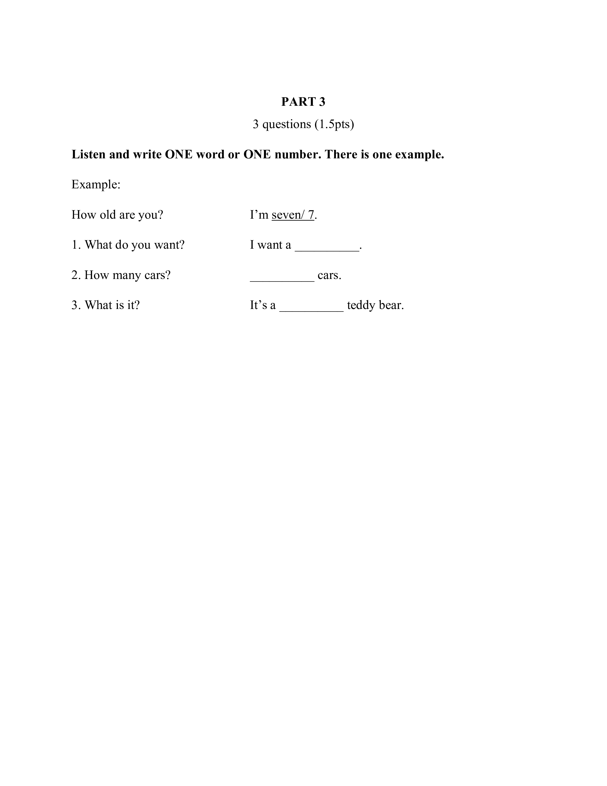 Listen and write ONE word or ONE number. There is one example. Example: How old are you? I’m seven/ 7. 1. What do you want? I want a __________. 2. How many cars? __________ cars. 3. What is it?