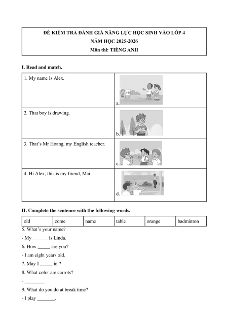 ĐỀ KIỂM TRA ĐÁNH GIÁ NĂNG LỰC HỌC SINH VÀO LỚP 4 NĂM HỌC 2025-2026 Môn thi: TIẾNG ANH I. Read and match. 1. My name is Alex. a. 2. That boy is drawing. b.