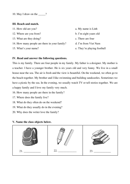 9. What do you do at break time? - I play _______. 10. May I draw on the _____? III. Reach and match. 11. How old are you? a. My name is Linh 12. Where are you from? b. I’m eight years old 13. What are they doing? c. There are four