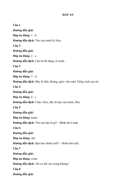 Hướng dẫn dịch: Chào Alex, đây là bạn của mình, Mai. Câu 5 Hướng dẫn giải: Đáp án đúng: name