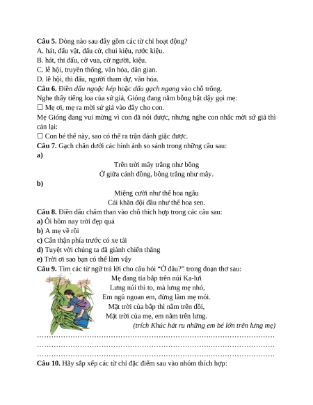 Câu 5. Dòng nào sau đây gồm các từ chỉ hoạt động?
