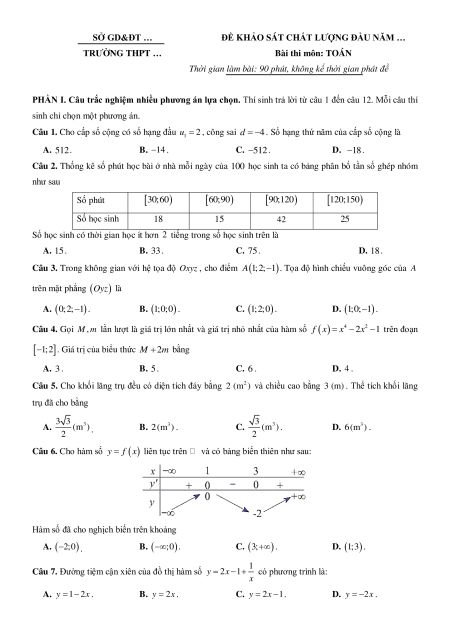 ĐỀ KHẢO SÁT CHẤT LƯỢNG ĐẦU NĂM … TRƯỜNG THPT … Bài thi môn: TOÁN