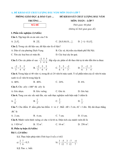 A. ĐỀ KHẢO SÁT CHẤT LƯỢNG ĐẦU NĂM MÔN TOÁN LỚP 7