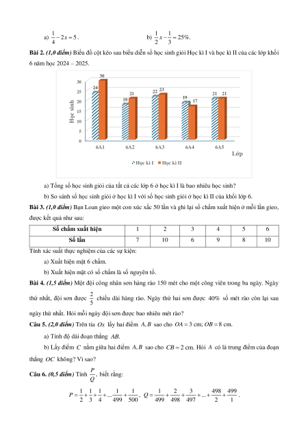 Bài 2. (1,0 điểm) Biểu đồ cột kéo sau biểu diễn số học sinh giỏi Học kì I và học kì II của các lớp khối 6 năm học 2024 – 2025. 30 30 24 23 25 22 21 21 21 18 19 h 20 17 ins 15 Học 10 5 0 6A1 6A2 6A3 6A4 6A5 Lớp Học kì I Học kì II