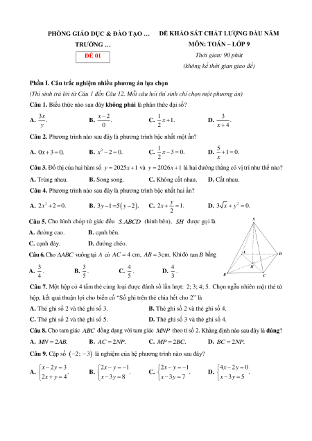 MÔN: TOÁN – LỚP 9 ĐỀ 01 Thời gian: 90 phút