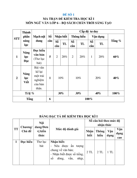 Bộ 30 đề thi cuối kì 1 Ngữ văn 6 Chân trời sáng tạo Cấu trúc mới