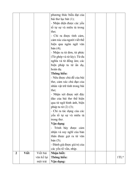 Mạch nội Số Nhâ ̣n biết Thông hiểu Vâ ̣n du ̣ng STT năng dung câu Tổng % Số Số Số lực TL TL TL câu câu câu Đọc hiểu Năng văn bản 1 lực 5 2 20% 2 20% 1 20% 60% (Thơ lục Đọc bát) Bài văn kể lại Năng một trải 2 lực nghiệm 1 10% 10% 20% 40% Viết của bản thân. Tỉ lê ̣ % 30% 30% 40% 100% Tổng 6 100%