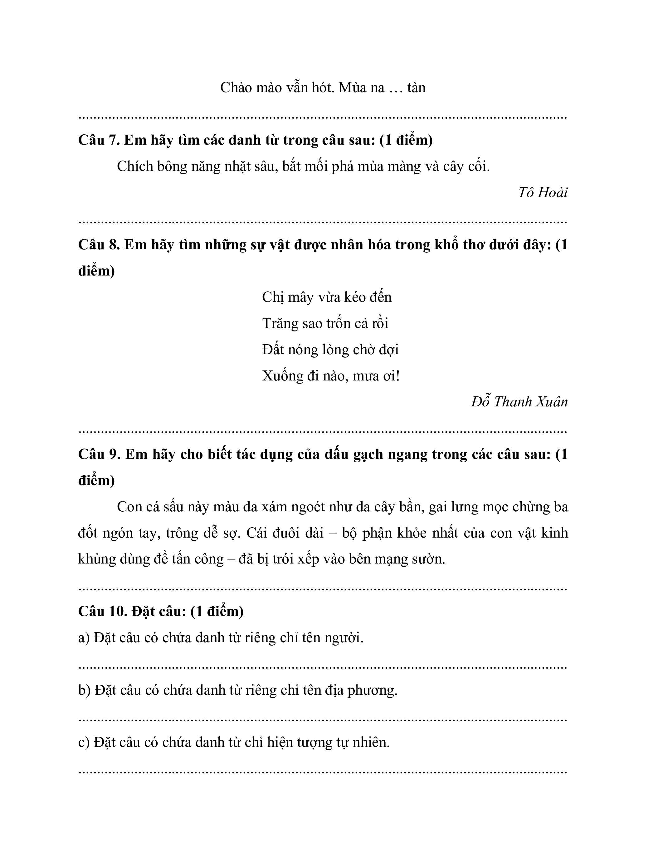 Câu 7. Em hãy tìm các danh từ trong câu sau: (1 điểm)
