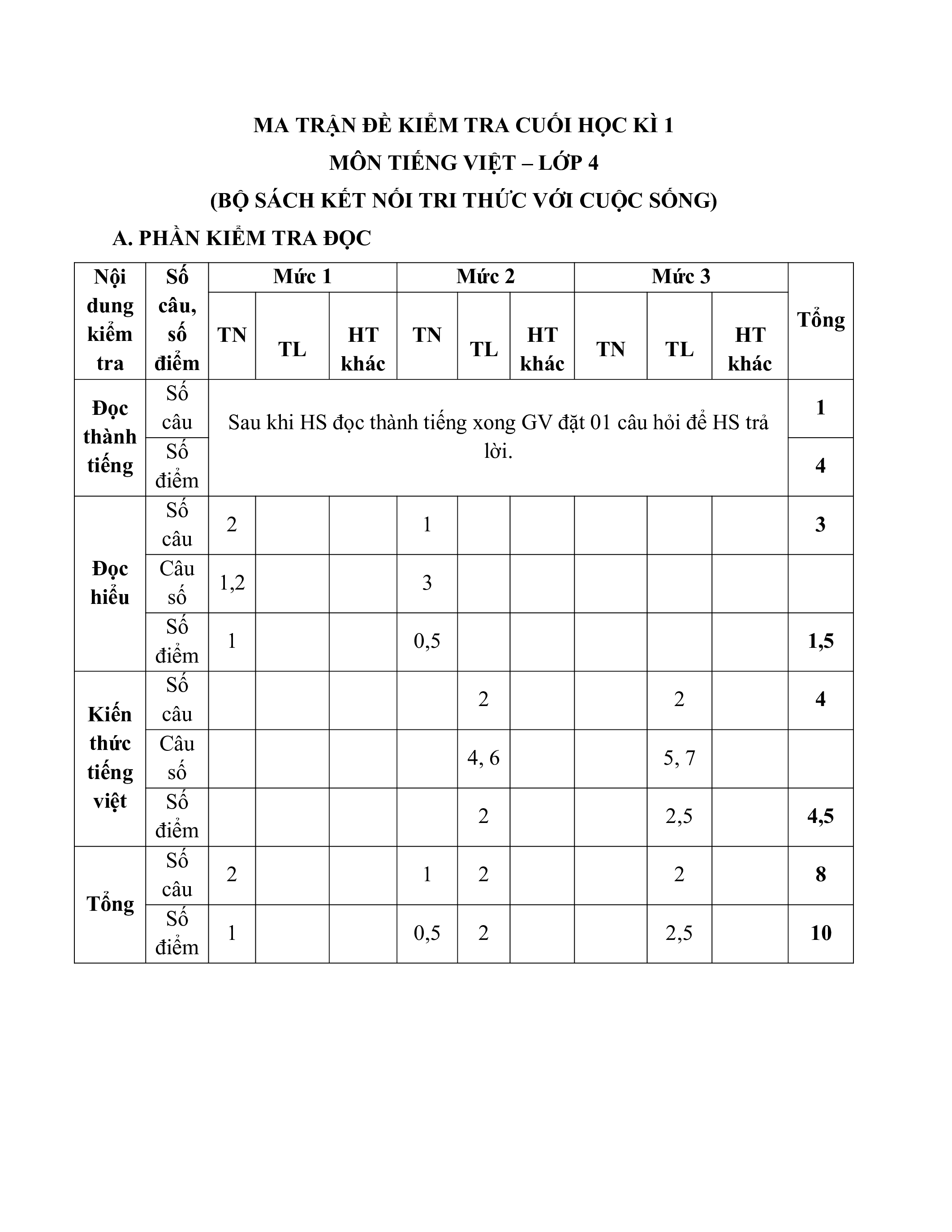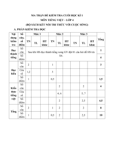 A. PHẦN KIỂM TRA ĐỌC Nội Số Mức 1 Mức 2 Mức 3 dung câu, kiểm số Tổng TN TN tra điểm TL HT khác TL HT khác TN TL HT khác Đọc Số 1 thành câu