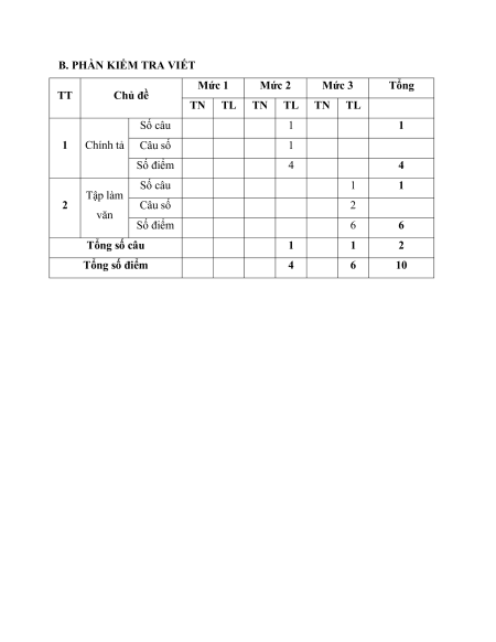 B. PHẦN KIỂM TRA VIẾT Mức 1 Mức 2 Mức 3 Tổng TT Chủ đề TN TL TN TL TN TL Số câu 1 1 1 Chính tả Câu số 1 Số điểm 4 4 Số câu 1 1 Tập làm 2 Câu số 2 văn Số điểm 6 6 Tổng số câu 1 1 2 Tổng số điểm 4 6 10 ĐỀ SỐ 1
