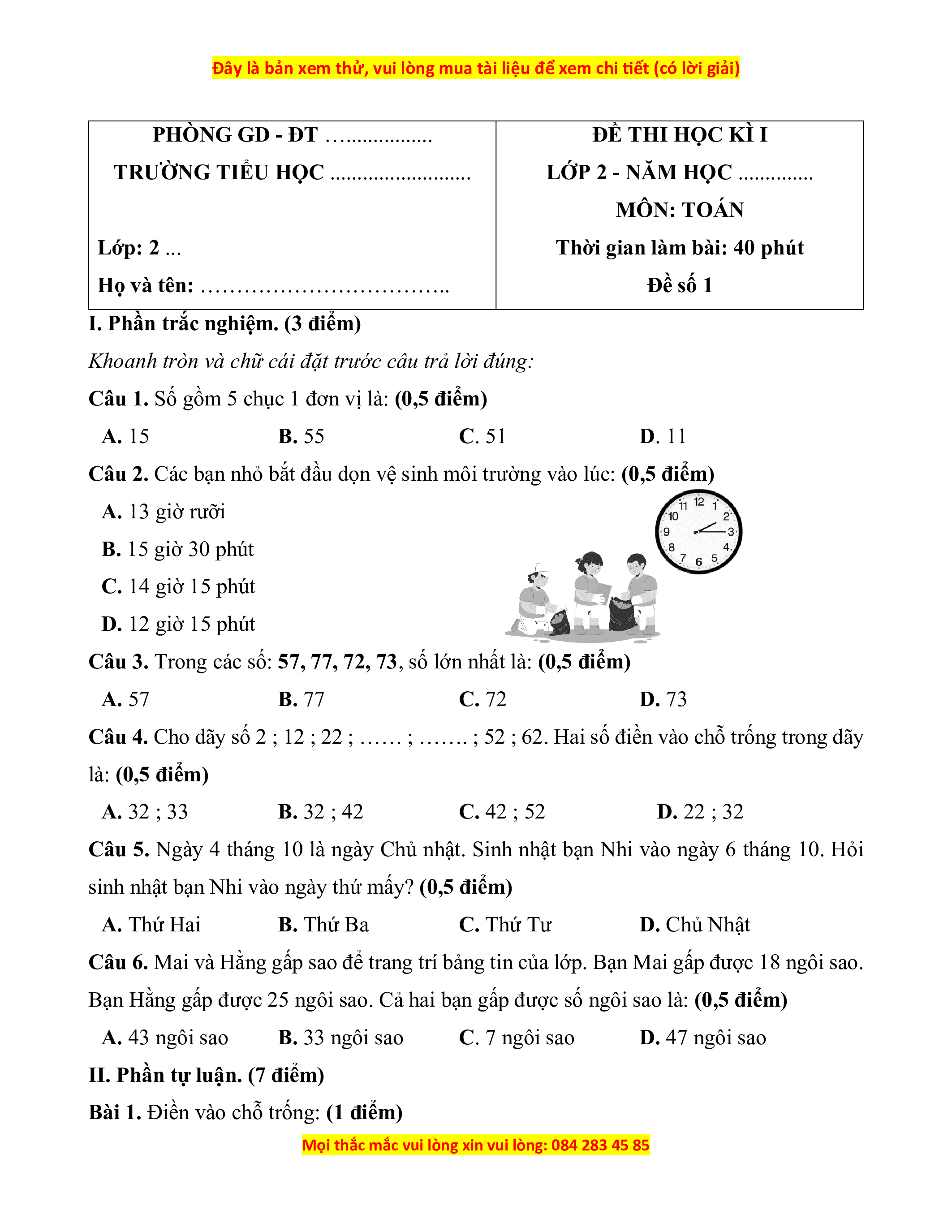 Bộ 30 đề thi cuối kì 1 Toán lớp 2 Chân trời sáng tạo có đáp án