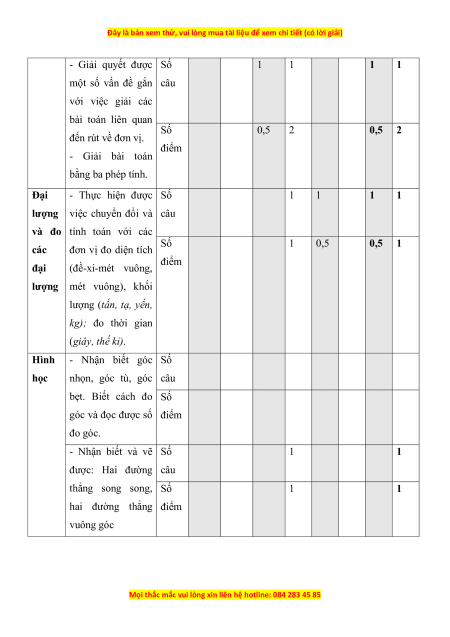 một số vấn đề gắn câu với việc giải các bài toán liên quan Số 0,5 2 0,5 2 đến rút về đơn vị. điểm - Giải bài toán bằng ba phép tính. Đại - Thực hiện được Số 1 1 1 1
