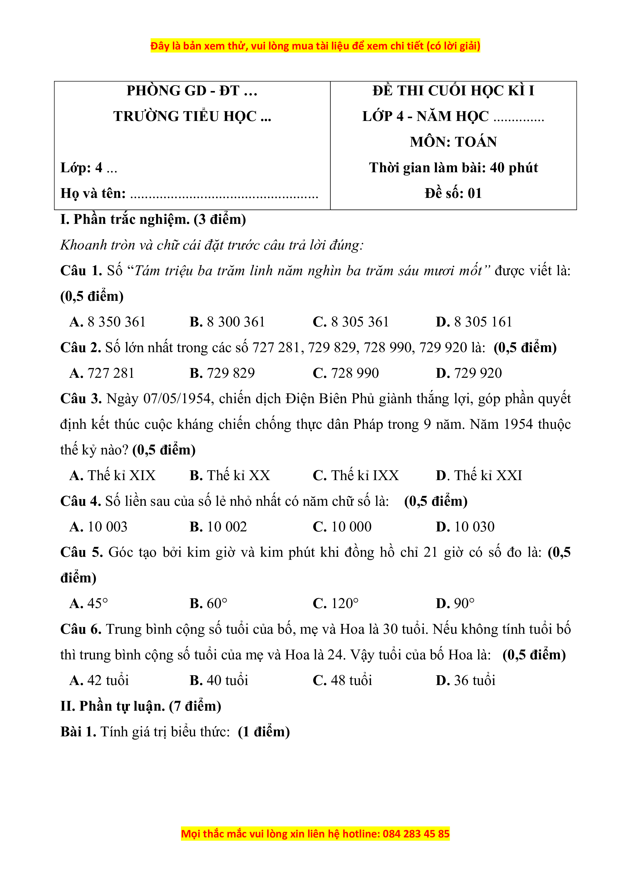 Câu 1. Số “Tám triệu ba trăm linh năm nghìn ba trăm sáu mươi mốt” được viết là: (0,5 điểm) A. 8 350 361 B. 8 300 361 C. 8 305 361 D. 8 305 161