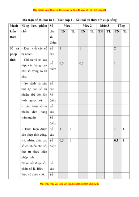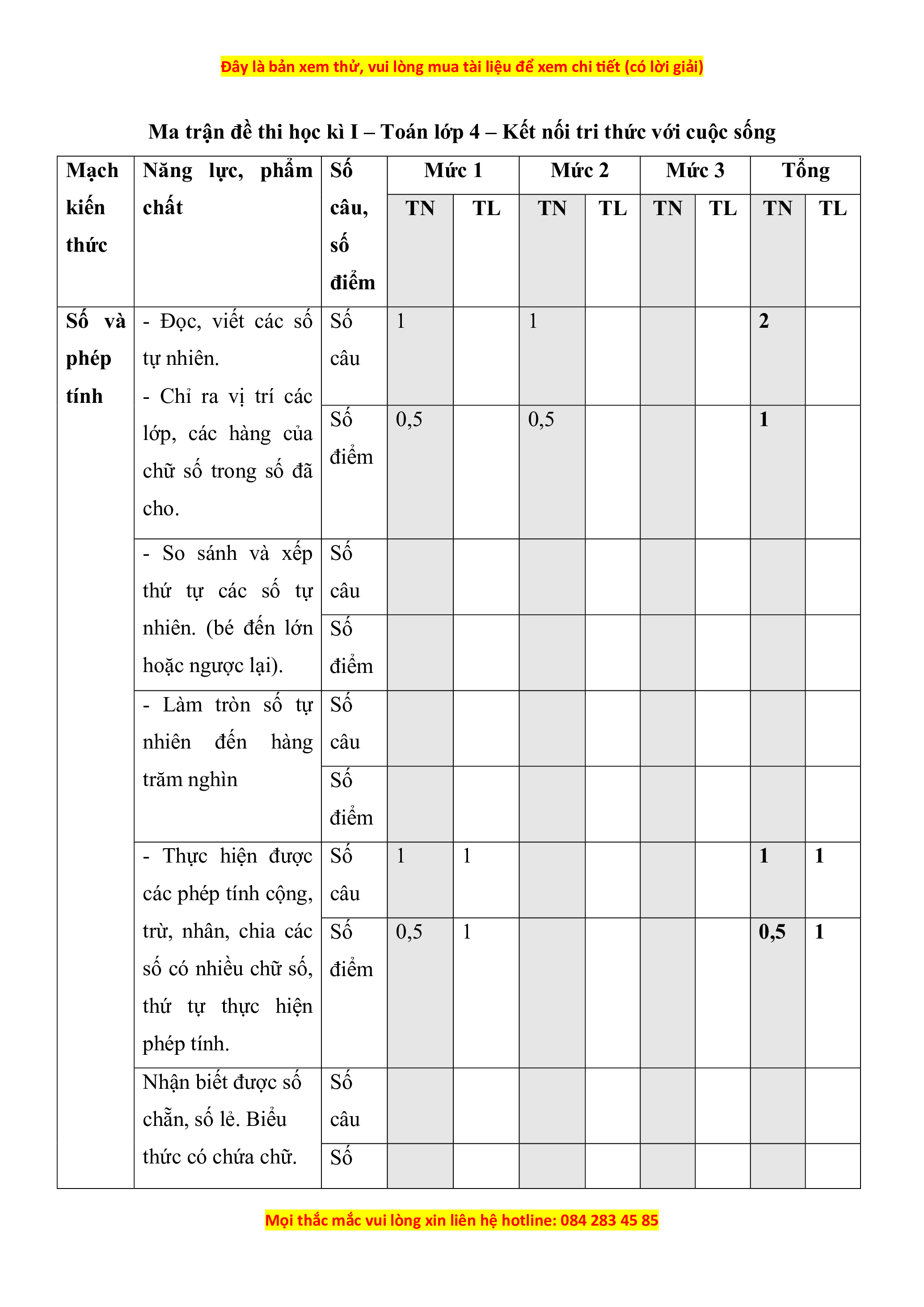 Ma trận đề thi học kì I – Toán lớp 4 – Kết nối tri thức với cuộc sống