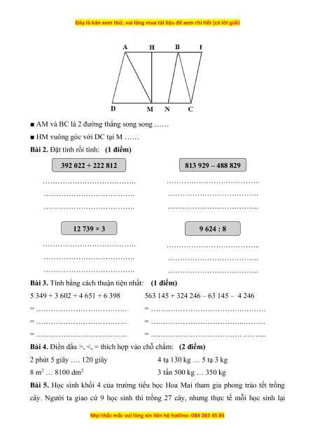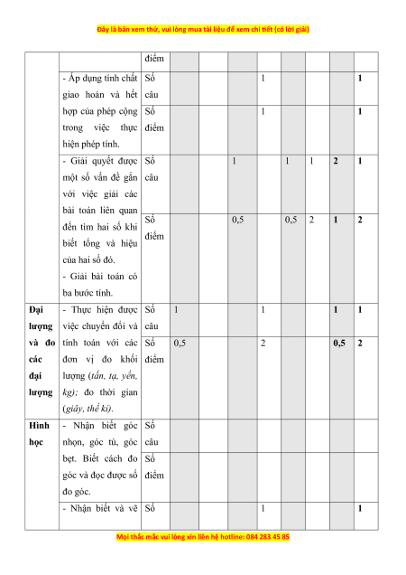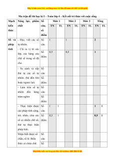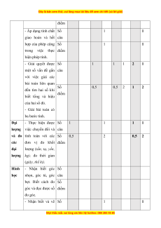 nhiên. (bé đến lớn Số hoặc ngược lại). điểm - Làm tròn số tự Số nhiên đến hàng câu trăm nghìn Số điểm - Thực hiện được Số 1 1 1 1 các phép tính cộng, câu trừ, nhân, chia các Số 0,5 1 0,5 1