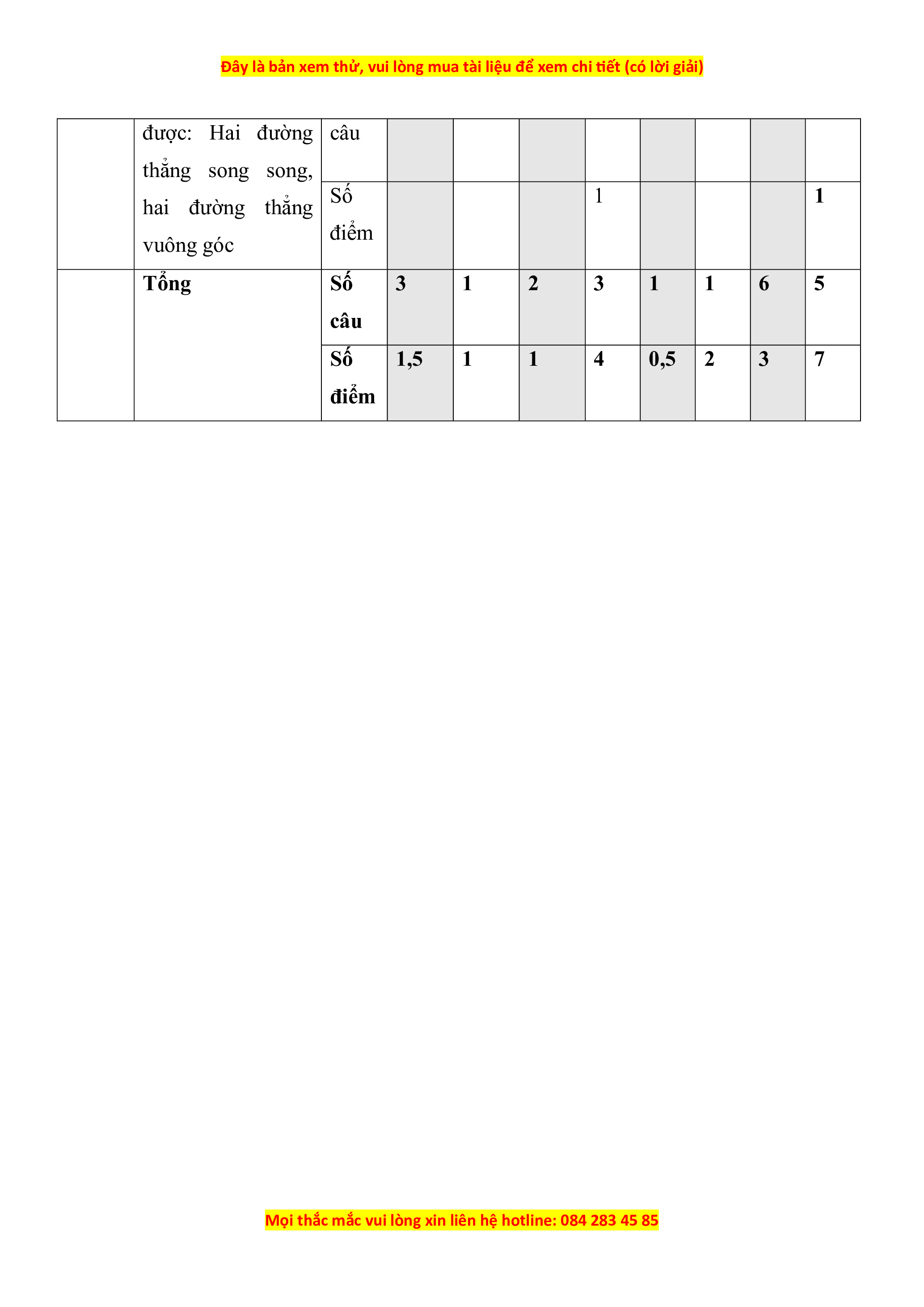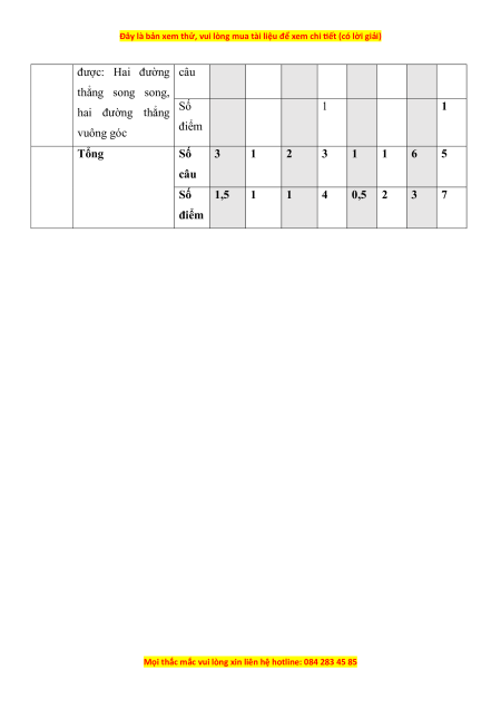 được: Hai đường câu thẳng song song, hai đường thẳng Số 1 1 điểm vuông góc Tổng Số 3 1 2 3 1 1 6 5 câu Số 1,5 1 1 4 0,5 2 3 7 điểm