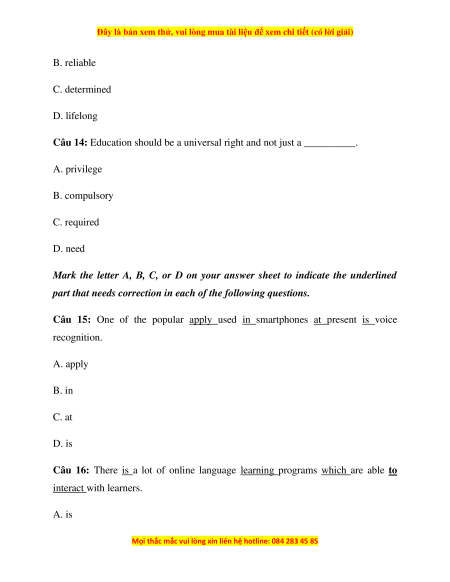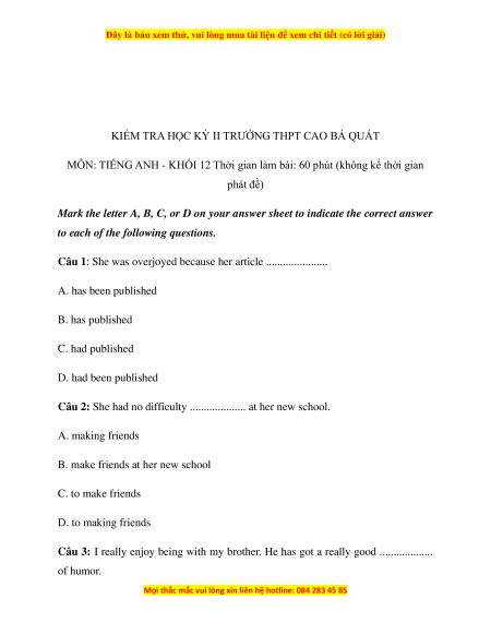 Câu 1: She was overjoyed because her article ...................... A. has been published B. has published C. had published D. had been published