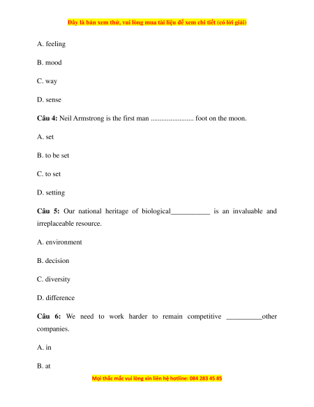 Câu 5: Our national heritage of biological___________ is an invaluable and irreplaceable resource. A. environment B. decision C. diversity D. difference