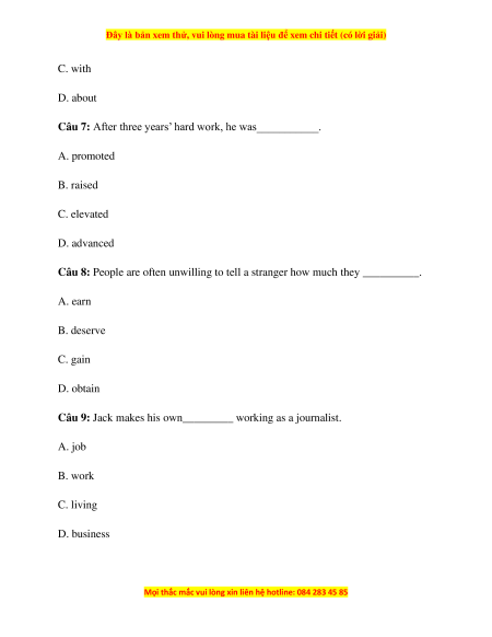 Câu 7: After three years’ hard work, he was___________. A. promoted B. raised C. elevated D. advanced