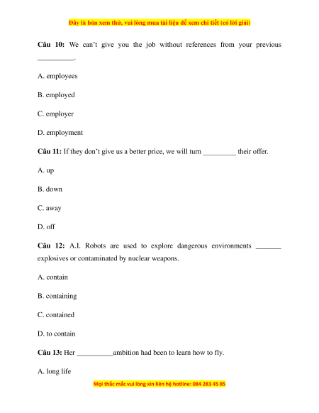 Câu 10: We can’t give you the job without references from your previous __________. A. employees B. employed C. employer D. employment