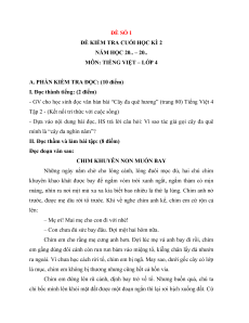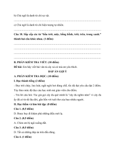 Sau khi HS đọc thành tiếng xong GV đặt 01 câu hỏi để HS trả h Số lời. 4 tiếng điểm Số 2 1 3 câu Đọc Câu 1,2 3 hiểu số Số 1 0,5 1,5 điểm Số 2 2 4 Kiến câu thức Câu 4, 6 5, 7 tiếng số việt Số 2 2,5 4,5 điểm Số 2 1 2 2 8 câu Tổng Số 1 0,5 2 2,5 10 điểm