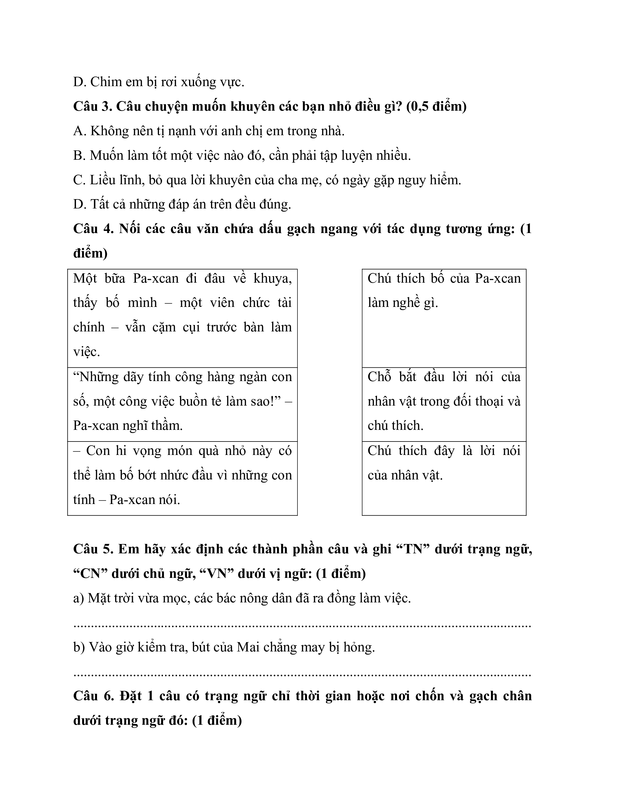 Câu 4. Nối các câu văn chứa dấu gạch ngang với tác dụng tương ứng: (1 điểm)