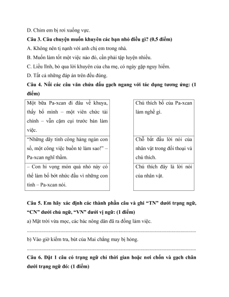 Câu 6. Đặt 1 câu có trạng ngữ chỉ thời gian hoặc nơi chốn và gạch chân