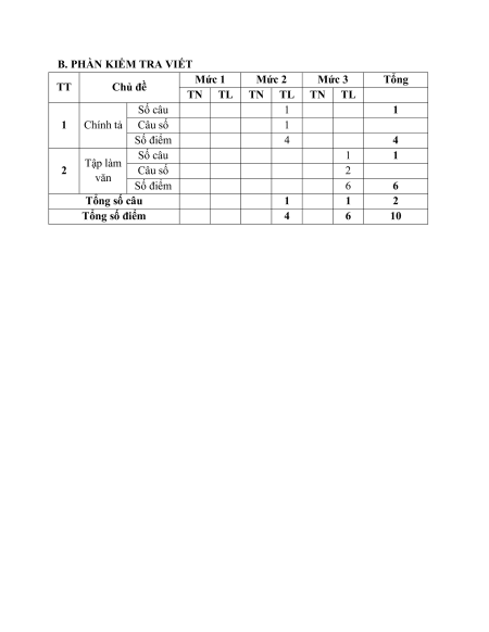 B. PHẦN KIỂM TRA VIẾT TT Chủ đề Mức 1 Mức 2 Mức 3 Tổng TN TL TN TL TN TL Số câu 1 1 1 Chính tả Câu số 1 Số điểm 4 4 Số câu 1 1 2 Tập làm văn Câu số 2 Số điểm 6 6 Tổng số câu 1 1 2 Tổng số điểm 4 6 10 ĐỀ SỐ 1